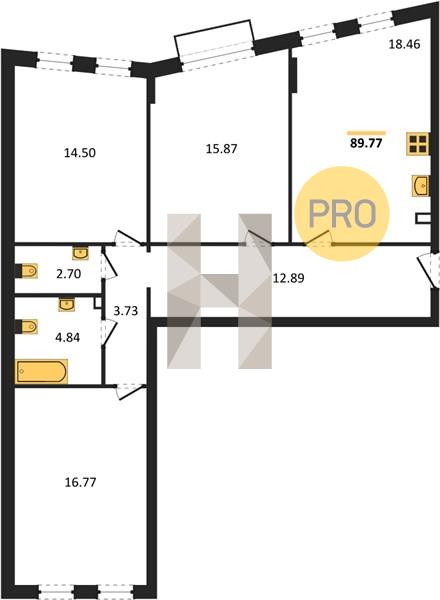 3-комн. квартира, 89.77 м²