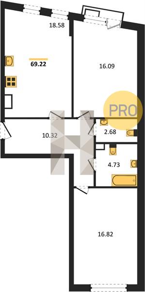 2-комн. квартира, 69.22 м²