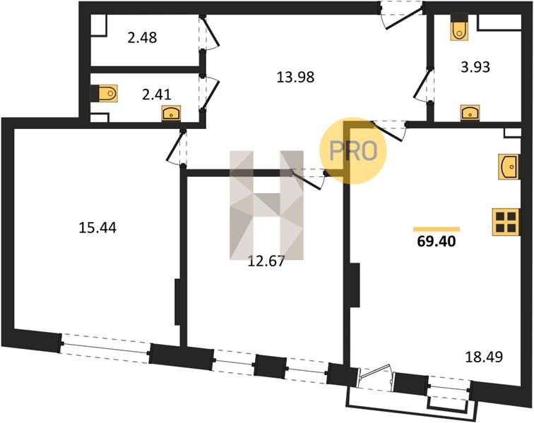 2-комн. квартира, 69.40 м²