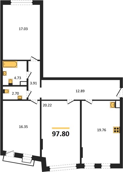 3-комн. квартира, 97.58 м²