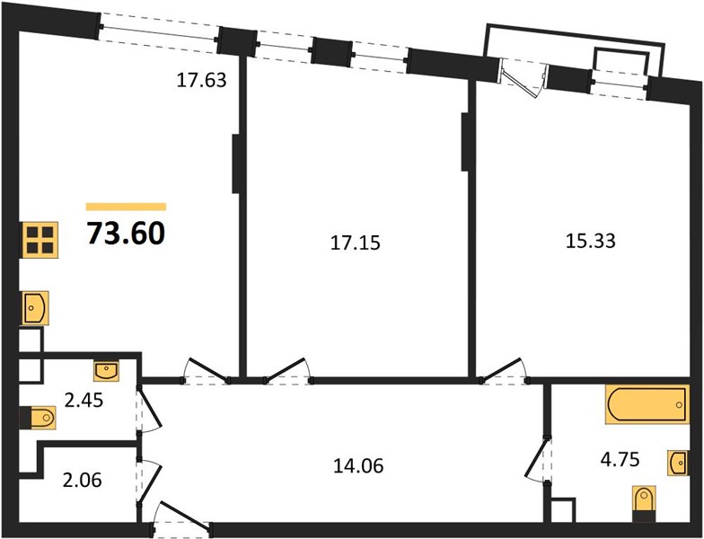 2-комн. квартира, 73.42 м²