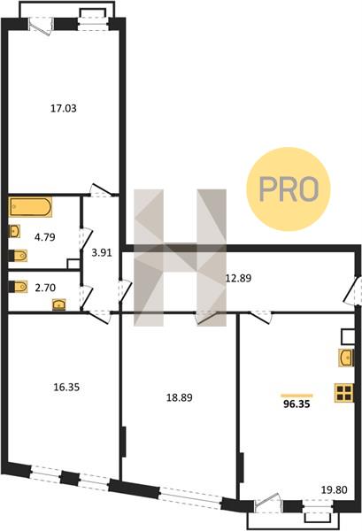3-комн. квартира , 96.35 м²