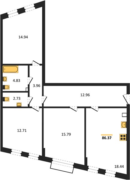 3-комн. квартира, 86.37 м²