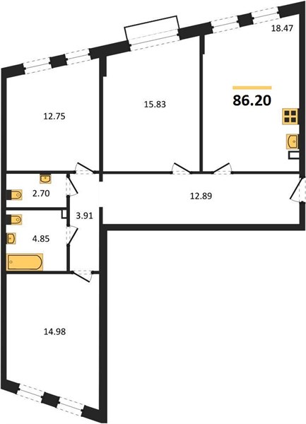 3-комн. квартира, 86.36 м²